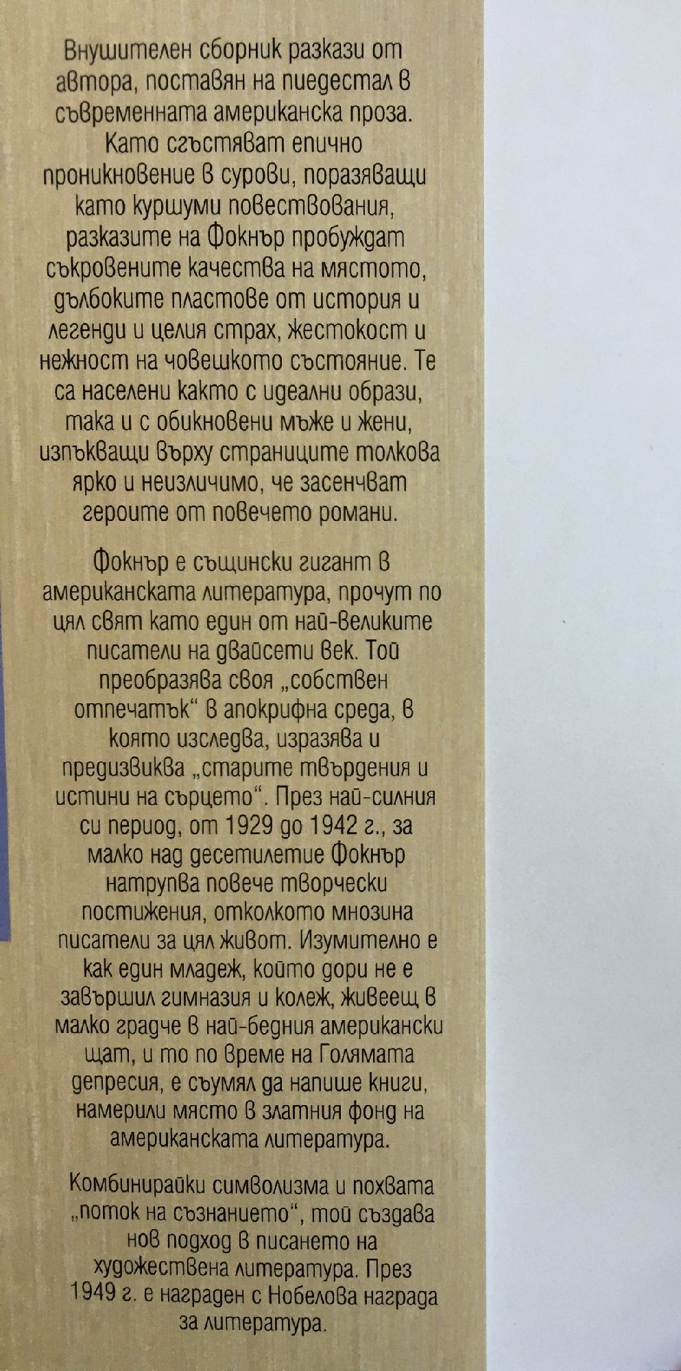 Внушителен сборник разкази от автора, поставян на пиедестал в съвременната американска проза. Като сгъстяват епично проникновение в сурови, поразяващи като куршуми повествования, разказите на Фокнър пробуждат съкровените качества на мястото, дълбоките пластове от история и легенди и целия страх, жестокост и нежност на човешкото състояние. Те са населени както с идеални образи, така и с обикновени мъже и жени, изпъкващи върху страниците толкова ярко и неизличимо, че засенчват героите от повечето романи. Фокнър е същински гигант в американската литература, прочут по цял свят като един от най-великите писатели на двайсети век. Той преобразява своя „собствен отпечатък“ в апокрифна среда, в която изследва, изразява и предизвиква „старите твърдения и истини на сърцето“. През най-силния си период, от 1929 до 1942 г., за малко над десетилетие Фокнър натрупва повече творчески постижения, отколкото мнозина писатели за цял живот. Изумително е как един младеж, който дори не е завършил гимназия и колеж, живеещ в малко градче в най-бедния американски щат, и то по време на Голямата депресия, е съумял да напише книги, намерили място в златния фонд на американската литература. Комбинирайки символизма и похвата „поток на съзнанието“, той създава нов подход в писането на художествена литература. През 1949 г. е награден с Нобелова награда за литература.
