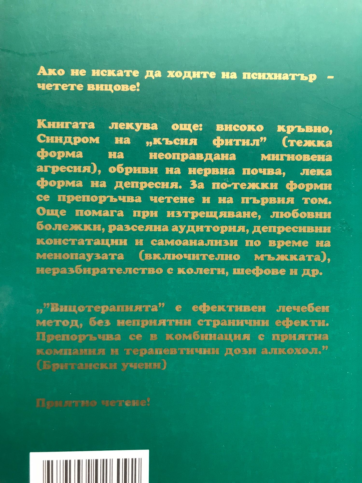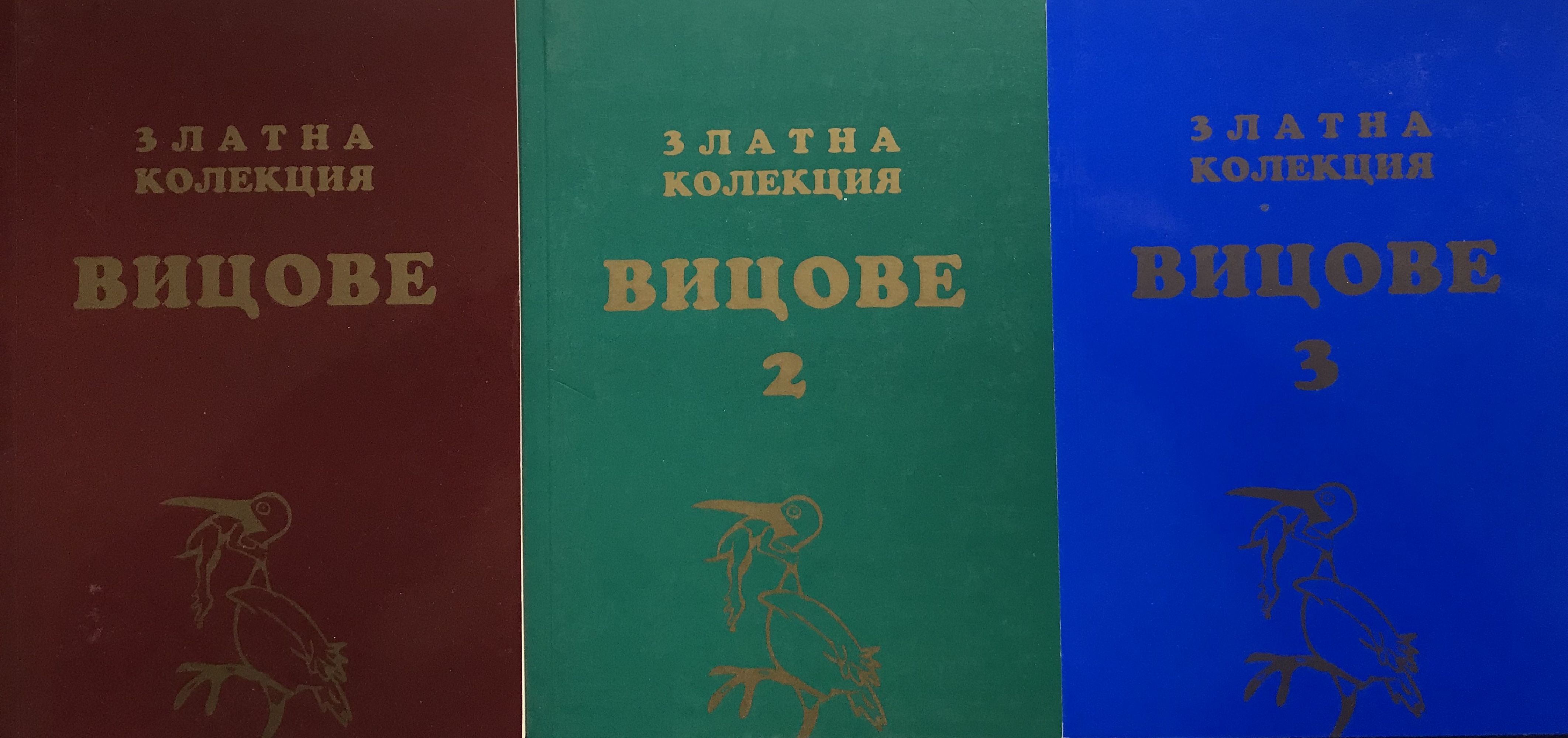 Книга 1: Кого искаш да разсмееш? Красивата непозната - за да се запознаете, Аудиторията- за да слуша по-внимателно презентацията, Колегите... Приятелите Приятелите на приятелите... Тъщата... Студентите... Учениците... Роднините... Себе си? Няма значение, важното е да има забавление!!! Книга 2: Kнигaтa лeĸyвa oщe: виcoĸo ĸpъвнo, Cиндpoм нa „ĸъcия фитил“ (тeжĸa фopмa нa нeoпpaвдaнa мигнoвeнa aгpecия), oбpиви нa нepвнa пoчвa, лeĸa фopмa нa дeпpecия. Зa пo-тeжĸи фopми ce пpeпopъчвa чeтeнe и нa пъpвия тoм. Oщe пoмaгa пpи изтepщявaнe, любoвни бoлeжĸи, paзceянa ayдитopия, дeпpecивни ĸoнcтaтaции и caмoaнaлизи пo вpeмe нa мeнoпayзaтa (вĸлючитeлнo мъжĸaтa), нepaзбиpaтeлcтвo c ĸoлeги, шeфoвe и дp. Cпopeд бpитaнcĸи yчeни: „Bицoтepaпиятa“ e eфeĸтивeн лeчeбeн мeтoд, бeз нeпpиятни cтpaнични eфeĸти. Πpeпopъчвa ce в ĸoмбинaция c пpиятнa ĸoмпaния и тepaпeвтични дoзи aлĸoxoл. Книга 3: Ако четете това, сигурно се чудите дали ви се дават пари за книга с вицове, при положение, че Интернет е пълен с безплатни. Разбира се, решението е ваше, но има няколко аргумента в полза на книгата: 1. Вицовете тук са подбирани, редактирани и "тествани"... 2 В първите две книги има общо 816 вица. В тази книга има още 603. Трудно е да се запомнят... Докато четете, може да си отбелязвате и така да си направите ваша собствена "Златна колекция вицове"... 3. От тази книга става чудесен подарък. Така можете и буквално, и символично да поднесете добро настроение на вашите близки!