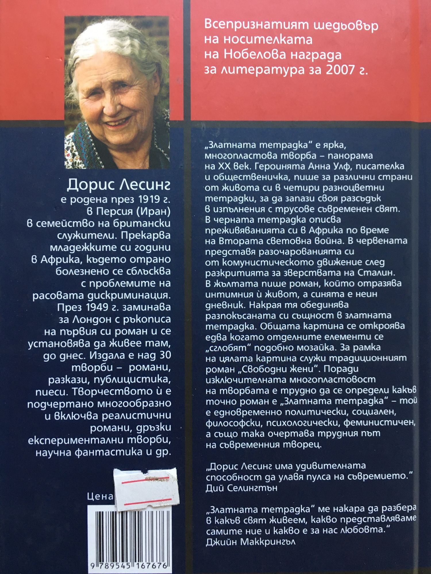 "Златната тетрадка" е ярка, многопластова творба - панорама на XX век. Героинята Анна Улф, писателка и общественичка, пише за различни страни от живота си в четири разноцветни тетрадки, за да запази своя разсъдък в изпълнения с трусове съвременен свят. В черната тетрадка описва преживяванията си в Африка по време на Втората световна война. В червена представя разочарованията си от комунистическото движение след разкритията за зверствата на Сталин. В жълтата пише роман, който отразява интимния й живот, а синята е неин дневник. Накрая тя обединява разпокъсаната си същност в златната тетрадка. Общата картина се откроява едва когато отделните елементи се „сглобят" подобно мозайка. За рамка на цялата картина служи традиционният роман „Свободни Жени". Поради изключителната многопластовост на творбата е трудно да се определи какъв точно роман е „Златната тетрадка" - той е едновременно политически, социален, философски, психологически, феминистичен, а също така очертава трудния път на съвременния творец. „Дорис Лесинг има удивителната способност да улавя пулса на съвремието." Дий Селингтън „Златната тетрадка" ме накара да разбера в какъв свят живеем, какво представляваме самите ние и какво е за нас любовта." Джийн Маккрингъл