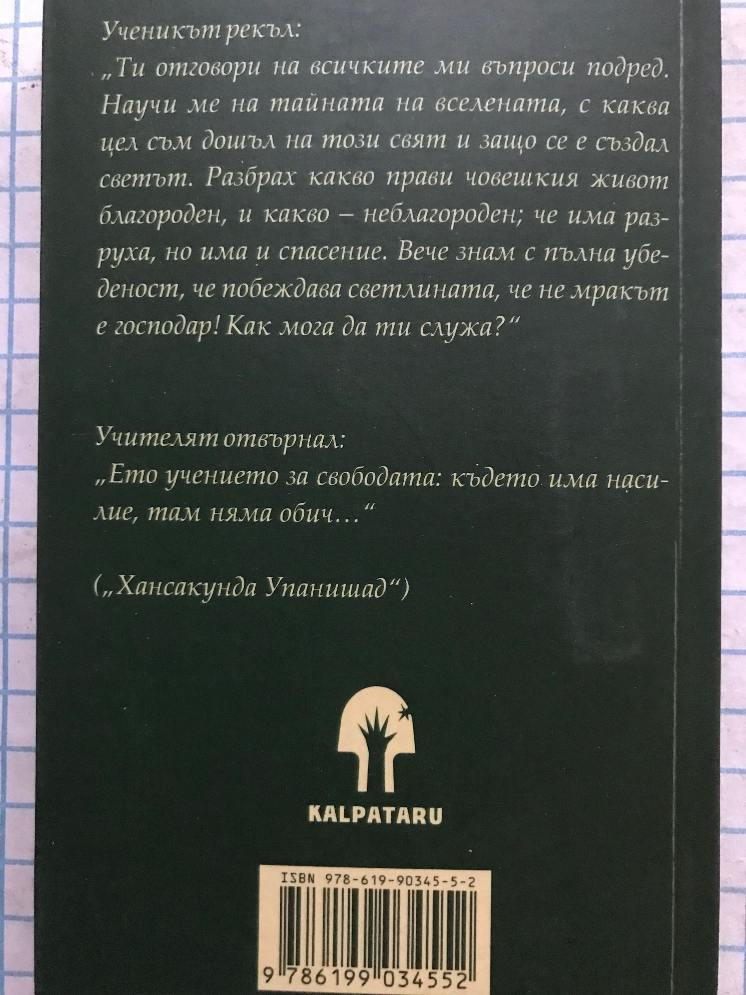 Ученикът рекъл: "Ти отговори на всичките ми въпроси подред. Научи ме на тайната на вселената, с каква цел съм дошъл на този свят и защо се е създал светът. Разбрах какво прави човешкия живот благороден, и какво - неблагороден; че има разруха, но има и спасение. Вече знам с пълна убеденост, че побеждава светлината, че не мракът е господар! Как мога да ти служа?" Учителят отвърнал: "Ето учението за свободата: където има насилие, там няма обич..." Хансакунда Упанишад