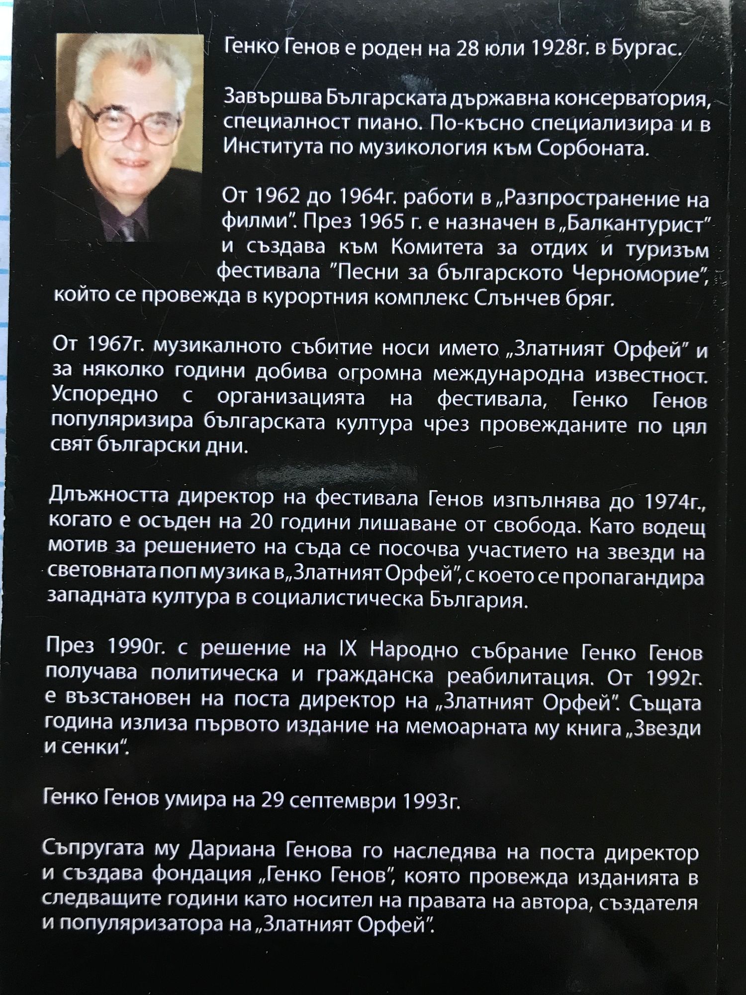 Генко Генов е роден на 28 юли 1928г. в Бургас. Завършва Българската държавна консерватория, специалност пиано. По-късно специализира и в Института по музикология към Сорбоната. От 1962 до 1964г. работи в „Разпространение на филми". През 1965 г. е назначен в „Балкантурист" и създава към Комитета за отдих и туризъм фестивала "Песни за българското Черноморие", който се провежда в курортния комплекс Слънчев бряг. От 1967г. музикалното събитие носи името „Златният Орфей" и за няколко години добива огромна международна известност. Успоредно с организацията на фестивала, Генко Генов популяризира българската култура чрез провежданите по цял свят български дни. Длъжността директор на фестивала Генов изпълнява до 1974г., когато е осъден на 20 години лишаване от свобода. Като водещ мотив за решението на съда се посочва участието на звезди на световната поп музика в„ЗлатниятОрфей", с което се пропагандира западната култура в социалистическа България. През 1990г. с решение на IX Народно събрание Генко Генов получава политическа и гражданска реабилитация. От 1992г. е възстановен на поста директор на „Златният Орфей". Същата година излиза първото издание на мемоарната му книга „Зве;зди и сенки". Генко Генов умира на 29 септември 1993г. Съпругата му Дариана Генова го наследява на поста директор и създава фондация „Генко Генов", която провежда изданията в следващите години като носител на правата на автора, създателя и популяризатора на „Златният Орфей".