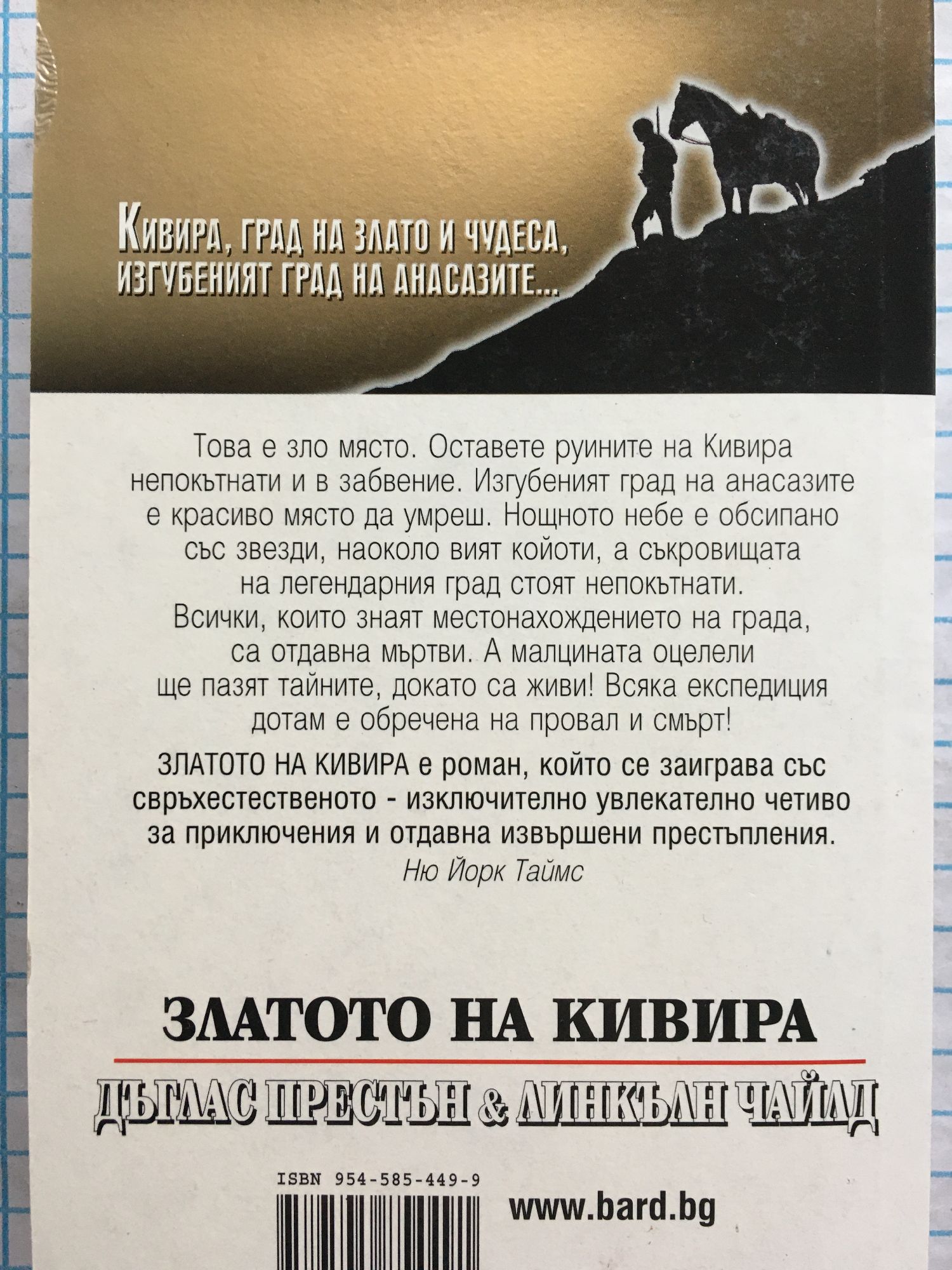 В търсене на изгубения град на анасазите... Кивира, град на злато и чудеса, изгубеният град на анасазите... Това е зло място. Оставете руините на Кивира непокътнати и в забвение. Изгубеният град на анасазите е красиво място да умреш. Нощното небе е обсипано със звезди, наоколо вият койоти, а съкровищата на легендарния град стоят непокътнати. Всички, които знаят местонахождението на града, са отдавна мъртви. А малцината оцелели ще пазят тайните, докато са живи! Всяка експедиция дотам е обречена на провал и смърт! “Златото на Кивира” е роман, който се заиграва със свръхестественото - изключително увлекателно четиво за приключения и отдавна извършени престъпления. Ню Йорк Таймс