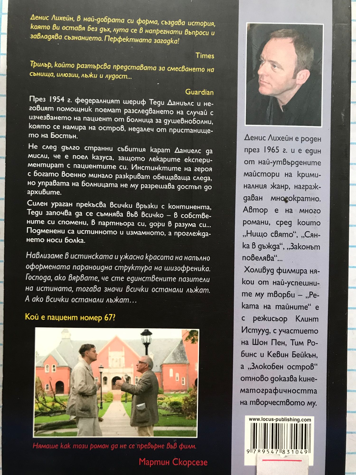 През 1954 г. федералният шериф Теди Даниелс и неговият помощник поемат разследването на случай с изчезването на пациент от болница за душевноболни, която се намира на остров, недалеч от пристанището на Бостън. Не след дълго странни събития карат Даниелс да мисли, че е поел казуса, защото лекарите експериментират с пациентите си. Инстинктите на героя с богато военно минало разкриват обещаваща следа, но управата на болницата не му разрешава достъп до архивите. Силен ураган прекъсва всички връзки с континента. Теди започва да се съмнява във всичко — в собствените си спомени, в партньора си, дори в разума си… Подменени са истинното и измамното, а проглеждането носи болка. Навлизаме в истинската и ужасна красота на напълно оформената параноидна структура на шизофреника. Господа, ако вярвате, че сте единствените пазители на истината, тогава значи всички останали лъжат. А ако всички останали лъжат… Денис Лихейн е роден през 1965 г. и е един от най-утвърдените майстори на криминалния жанр, награждаван многократно. Автор е на много романи, сред които „Нищо свято“, „Сянка в дъжда“, „Законът повелява“… Холивуд филмира някои от най-известните му творби — „Реката на тайните“ е с режисьор Клинт Истууд, с участието на Шон Пен, Тим Робинс и Кевин Бейкън, а „Злокобен остров“ отново доказва кинематографичността на творчеството му.