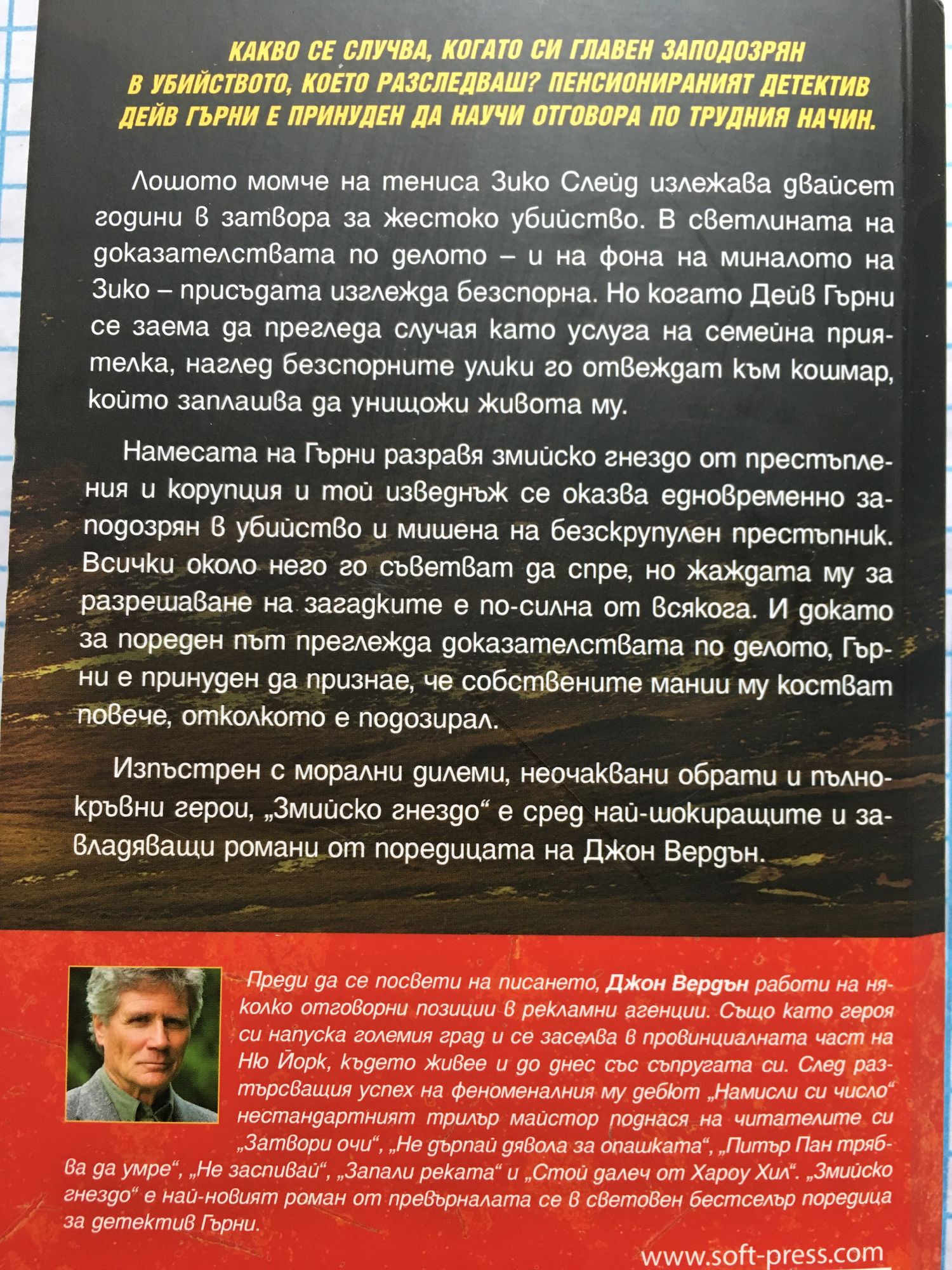 Какво се случва, когато си главен заподозрян в убийството, което разследваш? Пенсионираният детектив Дейв Гърни е принуден да научи отговора по трудния начин. Лошото момче на тениса Зико Слейд излежава двайсет години в затвора за жестоко убийство. В светлината на доказателствата по делото – и на фона на миналото на Зико – присъдата изглежда безспорна. Но когато Дейв Гърни се заема да прегледа случая като услуга на семейна приятелка, наглед безспорните улики го отвеждат към кошмар, който заплашва да унищожи живота му. Намесата на Гърни разравя змийско гнездо от престъпления и корупция и той изведнъж се оказва едновременно заподозрян в убийство и мишена на безскрупулен престъпник. Всички около него го съветват да спре, но жаждата му за разрешаване на загадките е по-силна от всякога. И докато за пореден път преглежда доказателствата по делото, Гърни е принуден да признае, че собствените мании му костват повече, отколкото е подозирал. Изпъстрен с морални дилеми, неочаквани обрати и пълнокръвни герои, „Змийско гнездо“ е сред най-шокиращите и завладяващи романи от поредицата на Джон Вердън.