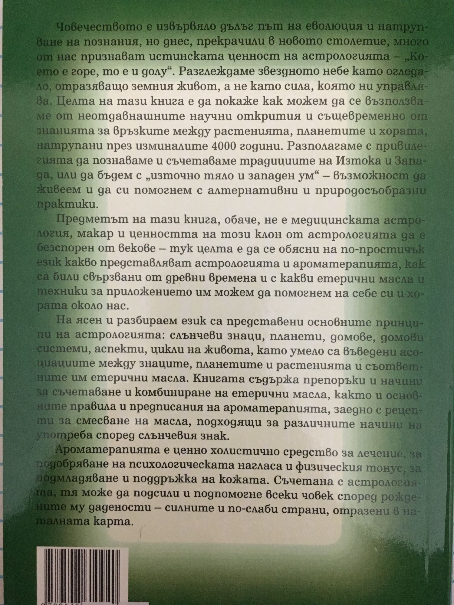Човечеството е извървяло дълъг път на еволюция и натрупване на познания, но днес, прекрачили в новото столетие, много от нас признават истинската ценност на астрологията – "Което е горе, то е и долу". Разглеждаме звездното небе като огледало, отразяващо земния живот, а не като сила, която ни управлява. Целта на тази книга е да покаже как можем да се възползваме от неотдавнашните научни открития и същевременно от знанията за връзките между растенията, планетите и хората, натрупани през изминалите 4000 години. Разполагаме с привилегията да познаваме и съчетаваме традициите на Изтока и Запада, или да бъдем с "източно тяло и западен ум" – възможност да живеем и да си помогнем с алтернативни и природосъобразни практики. Предметът на тази книга, обаче, не е медицинската астрология, макар и ценността на този клон от астрологията да е безспорен от векове – тук целта е да се обясни на по-простичък език какво представляват астрологията и ароматерапията, как са били свързвани от древни времена и с какви етерични масла и техники за приложението им можем да помогнем на себе си и хората около нас. На ясен и разбираем език са представени основните принципи на астрологията: слънчеви знаци, планети, домове, домови системи, аспекти, цикли на живота, като умело са въведени асоциациите между знаците, планетите и растенията и съответните им етерични масла. Книгата съдържа препоръки и начини за съчетаване и комбиниране на етерични масла, както и основните правила и предписания на ароматерапията, заедно с рецепти за смесване на масла, подходящи за различните начини на употреба според слънчевия знак. Ароматерапията е ценно холистично средство за лечение, за подобряване на психологическата нагласа и физическия тонус, за подмладяване и поддръжка на кожата. Съчетана с астрологията, тя може да подсили и подпомогне всеки човек според рождените му дадености – силните и по-слаби страни, отразени в наталната карта.
