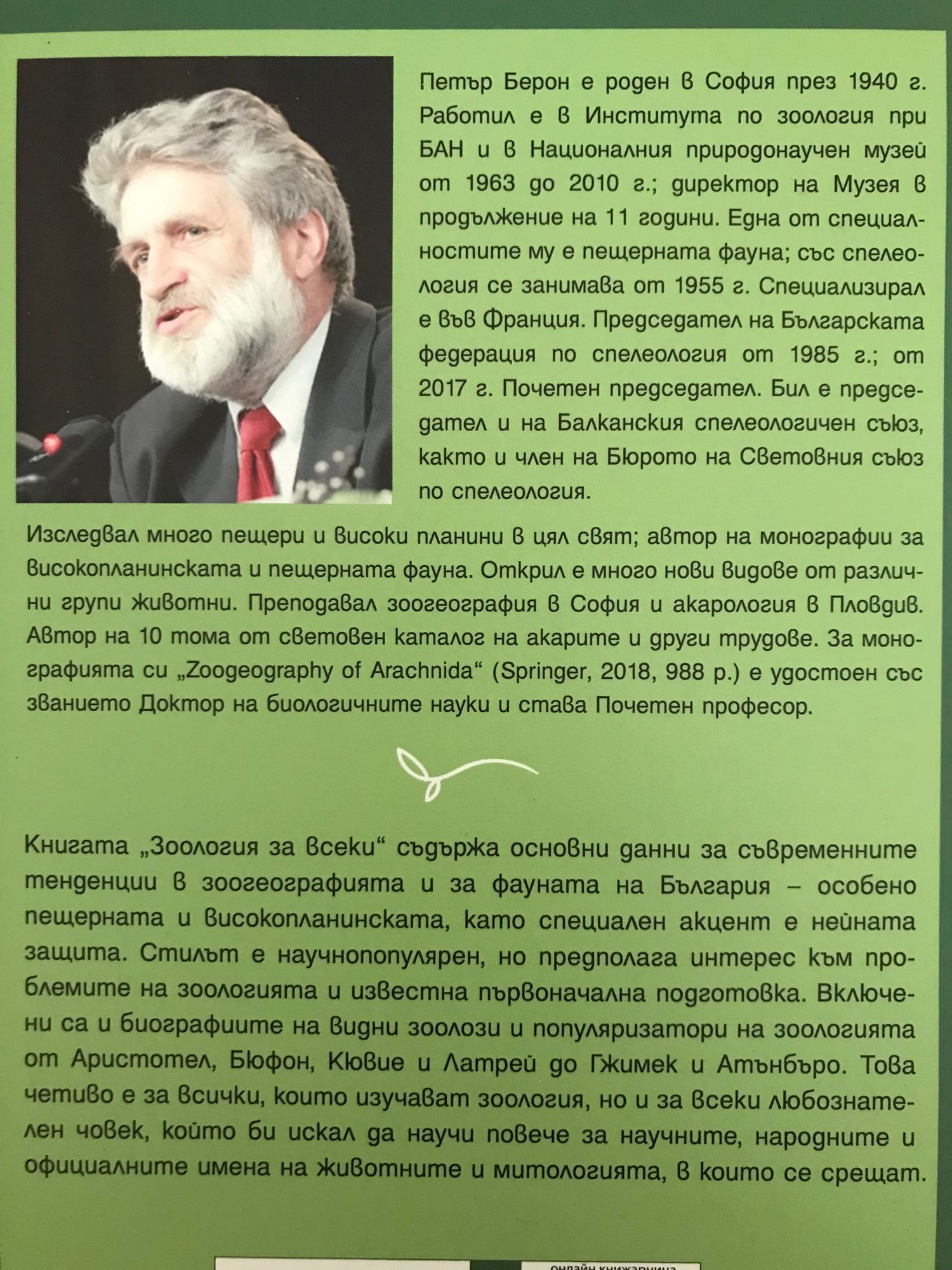 Петър Берон е роден в София през 1940 г. Работил е в Института по зоология при БАН и в Националния природонаучен музей от 1963 до 2010 г.; директор на Музея в продължение на 11 години. Една от специалностите му е пещерната фауна; със спелеология се занимава от 1955 г. Специализирал е във Франция. Председател на Българската федерация по спелеология от 1985 г.; от 2017 г. Почетен председател. Бил е председател и на Балканския спелеологичен съюз, както и член на Бюрото на Световния съюз по спелеология. Изследвал много пещери и високи планини в цял свят; автор на монографии за високопланинската и пещерната фауна. Открил е много нови видове от различни групи животни. Преподавал зоогеография в София и акарология в Пловдив. Автор на 10 тома от световен каталог на акарите и други трудове. За монографията си Zoogeography of Arachnida (Springer, 2018, 988 p.) е удостоен със званието Доктор на биологичните науки и става почетен професор. Книгата „Зоология за всеки“ съдържа основни данни за съвременните тенденции в зоогеографията и за фауната на България – особено пещерната и високопланинската, като специален акцент е нейната защита. Стилът е научнопопулярен, но предполага интерес към проблемите на зоологията и известна първоначална подготовка. Включени са и биографиите на видни зоолози и популяризатори на зоологията от Аристотел, Бюфон, Кювие и Латрей до Гжимек и Атънбъро. Това четиво е за всички, които изучават зоология, но и за всеки любознателен човек, който би искал да научи повече за научните, народните и официалните имена на животните и митологията, в които се срещат.