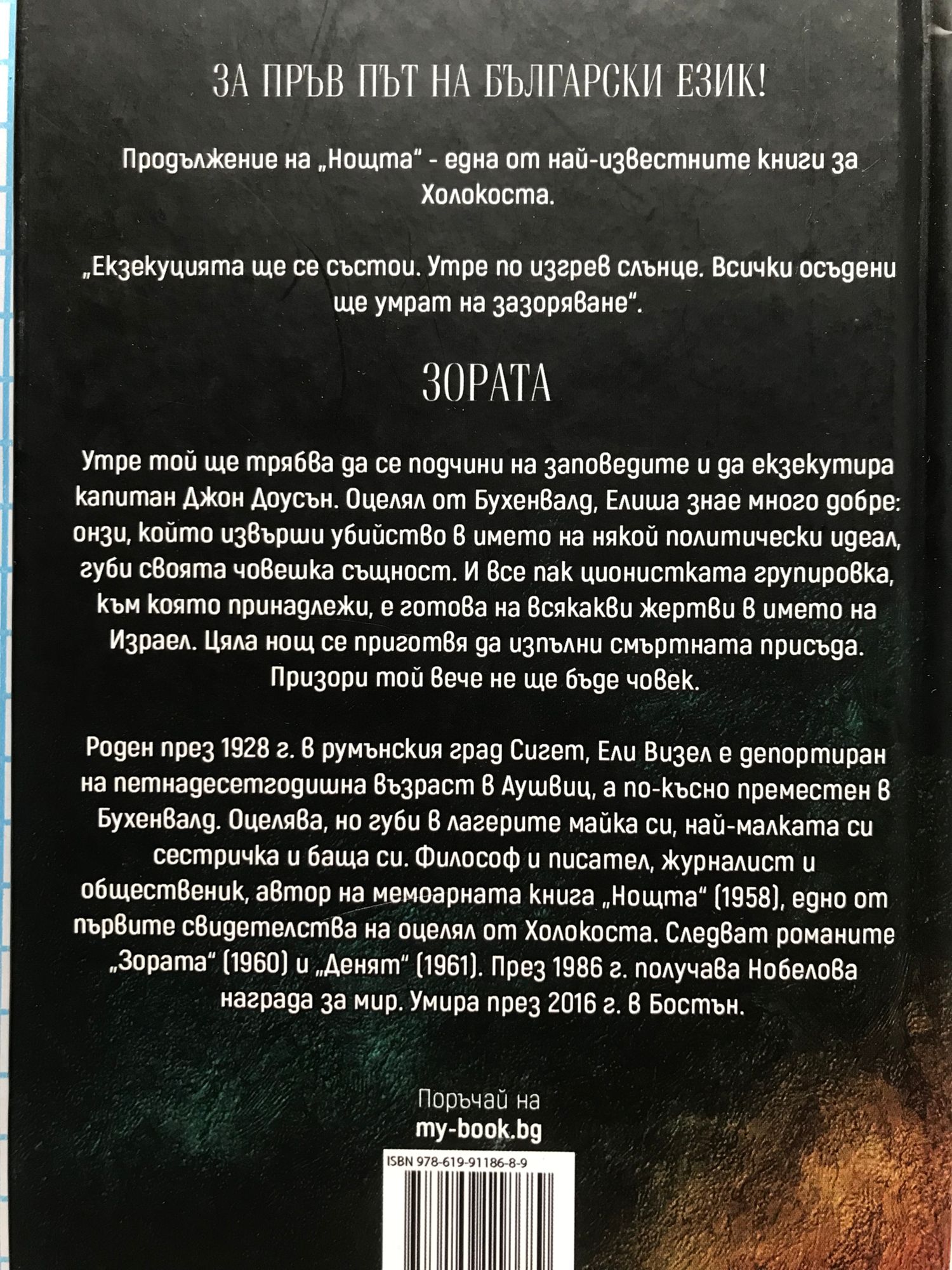 Екзекуцията ще се състои. Утре по изгрев слънце. Всички осъдени ще умрат на зазоряване. За пръв път на български език продължението на трилогията „Нощта“ - една от най-известните книги за Холокоста Утре той ще трябва да се подчини на заповедите и да екзекутира капитан Джон Доусън. Оцелял от Бухенвалд, Елиша знае много добре: онзи, който извърши убийство в името на някой политически идеал, губи своята човешка същност. И все пак ционистката групировка, към която принадлежи, е готова на всякакви жертви в името на Израел. Цяла нощ се приготвя да изпълни смъртната присъда. Призори той вече не ще бъде човек.