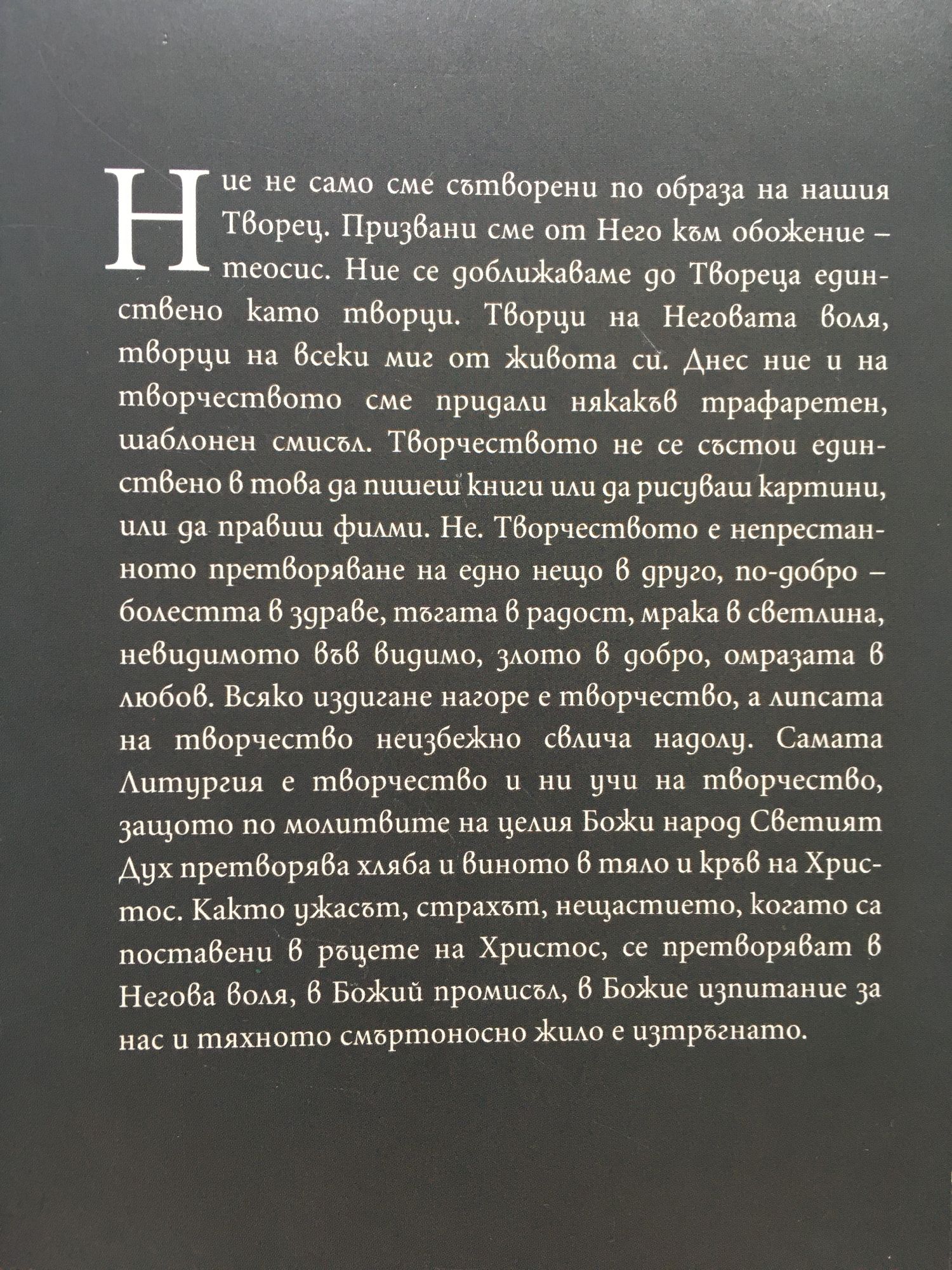 Ние не само сме сътворени по образа на нашия Творец. Призвани сме от Него към обожение – теосис. Ние се доближаваме до Твореца единствено като творци. Творци на Неговата воля, творци на всеки миг от живота си. Днес ние и на творчеството сме придали някакъв трафаретен, шаблонен смисъл. Творчеството не се състои единствено в това да пишеш книги или да рисуваш картини, или да правиш филми. Не. Творчеството е непрестанното претворяване на едно нещо в друго, по-добро – болестта в здраве, тъгата в радост, мрака в светлина, невидимото във видимо, злото в добро, омразата в любов. Всяко издигане нагоре е творчество, а липсата на творчество неизбежно свлича надолу. Самата Литургия е творчество и ни учи на творчество, защото по молитвите на целия Божи народ Светият Дух претворява хляба и виното в тяло и кръв на Христос. Както ужасът, страхът, нещастието, когато са поставени в ръцете на Христос, се претворяват в Негова воля, в Божий промисъл, в Божие изпитание за нас и тяхното смъртоносно жило е изтръгнато.
