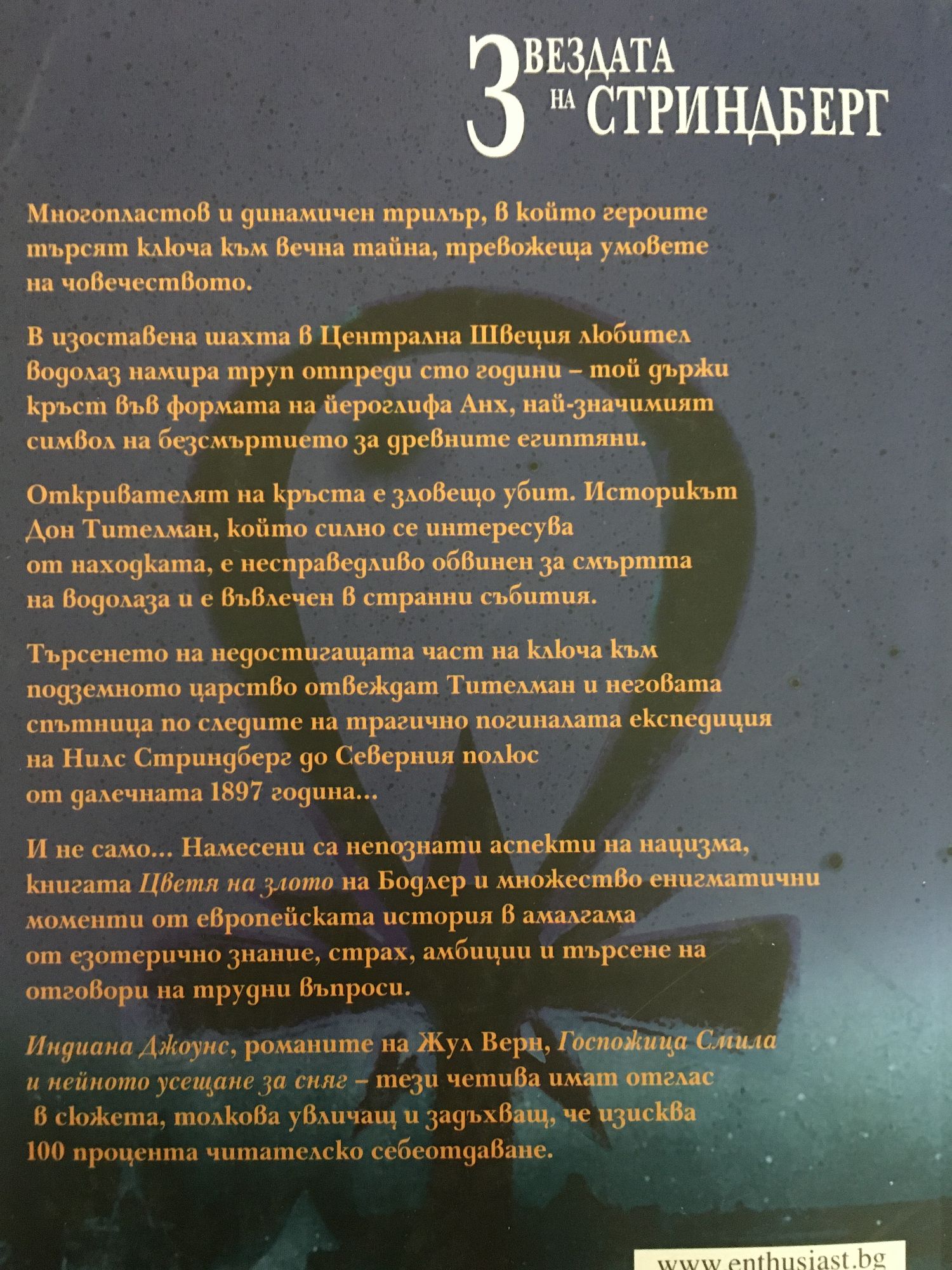Многопластов и динамичен трилър, в който героите търсят ключа към вечна тайна, тревожеща умовете на човечеството. В изоставена шахта в Централна Швеция любител водолаз намира труп отпреди сто години – той държи кръст във формата на йероглифа Анх, най-значимият символ на безсмъртието за древните египтяни. Откривателят на кръста е зловещо убит. Историкът Дон Тителман, който силно се интересува от находката, е несправедливо обвинен за смъртта на водолаза и въвлечен в странни събития. Търсенето на недостигащата част на ключа към подземното царство отвеждат Тителман и неговата спътница по следите на трагично погиналата експедиция на Нилс Стриндберг до Северния полюс от далечната 1897 година… И не само… Намесени са непознати аспекти на нацизма, книгата Цветя на злото на Бодлер и множество енигматични моменти от европейската история в амалгама от езотерично знание, страх, амбиции и търсене на отговори на трудни въпроси. Индиана Джоунс, романите на Жул Верн, Госпожица Смила и нейното усещане за сняг – тези четива имат отглас в сюжета, толкова увличащ и задъхващ, че изисква 100 процента читателско себеотдаване.